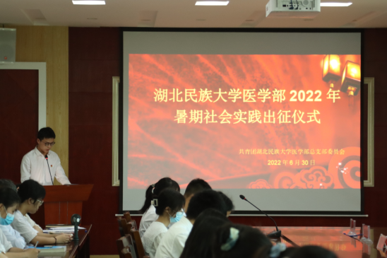 本网讯(通讯员 陈秋妙 黄倩霖/文 周威/摄)为贯彻落实习近平总书记关于青年学生工作的重要思想,引导和帮助广大青年学生上好与实践相结合的“大思政课”。6月30日,由共青团365电子娱乐官方网站医学部总支部委员会社会实践与志愿者工作部主办的2022年大学生暑期社会实践活动出征仪式在医学部七号会议室举行。医学部党委常务副书记、副主任廖云,医学部学生工作办公室主任周家頔以及各团队指导老师应邀出席,各立项团队代表参加本次大会。医学部杏林青年发展中心学生代表胡子超担任本次会议的主持人。