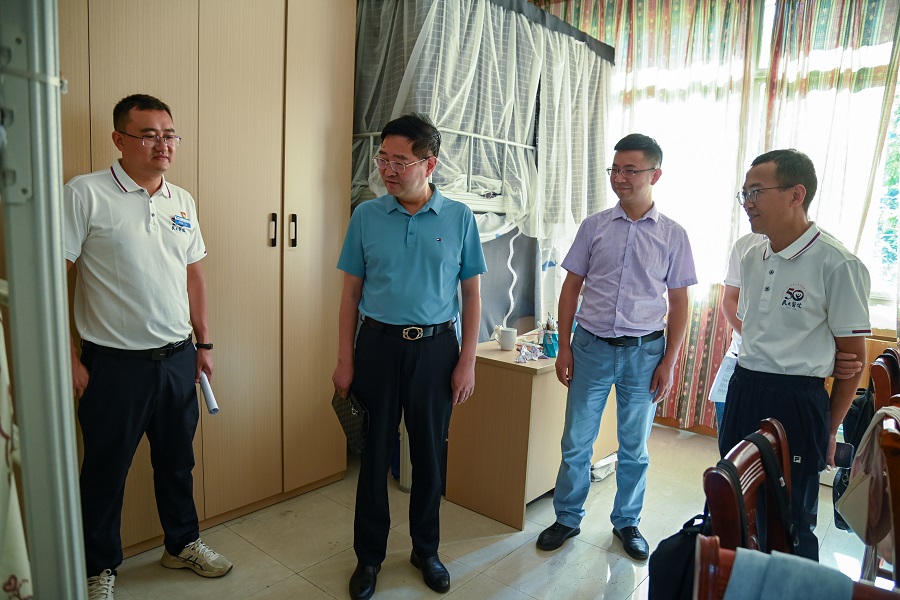 在视察宿舍搬迁工作、询问学生学习生活情况后,邓磊指出,学校重视人才发展,深化教学改革,致力于将临床医学与理论教学有机融合,从而提高人才素质,本次搬迁活动是深化教育改革的生动实践。此前,学校以荆门市第一人民医院作为实践点,已经进行了充分的前期尝试,累积了丰富经验。他强调,要将临床和理论教学有机融合,打通教学壁垒,积极带动学生从实际患情中有所思有所想,充分提高人才培养质量;要进行有效尝试,提升人才质量可衡量指标;要创新人才培养模式,基础医学与临床教学有效衔接,基础医学在教室,临床教学与见习相结合,多次、长期、深入实习获得经验。
