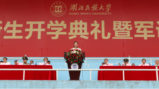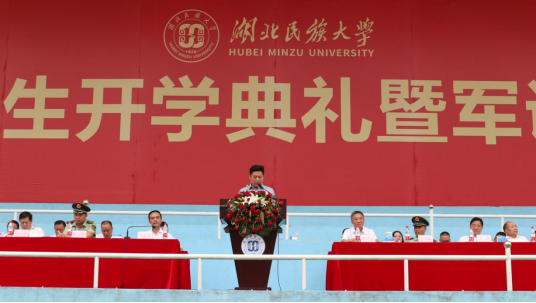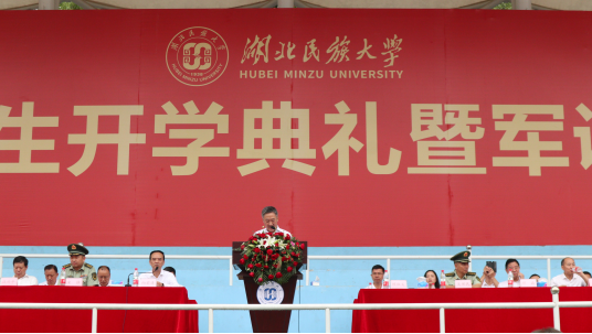本网讯 (记者 郑丽洁/文 周琦凯/摄)9月11日早上8时,我校在五环体育场举行2023级新生开学典礼。仪式由我校党委书记向前进主持,校长顿祖义,党委副书记、副校长汪兴平,党委副书记邓磊,党委常委、总会计师余来,党委常委、副校长李军,党委常委、副校长刘志军,中国人民武装警察部队恩施支队支队长宋强、政治委员吴保民,以及学校相关职能部门主要负责人,各二级学院(部)党委(党总支)书记、院长出席开学典礼。2023级预科生、本科生及研究生参加开学典礼。
