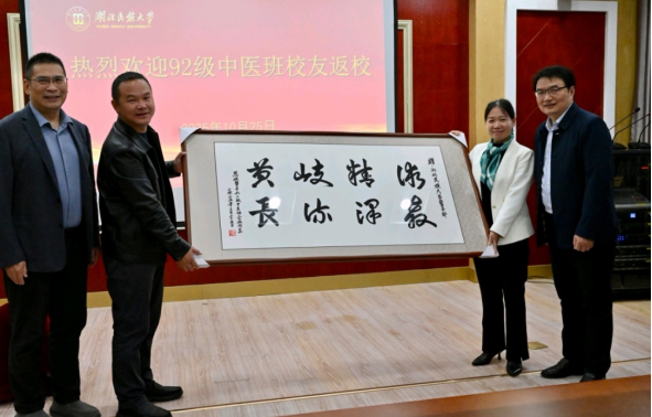 座谈会现场,1992级中医班校友代表全体同学,向母校赠送了书法匾额及一块具有3000年历史的孔雀石。