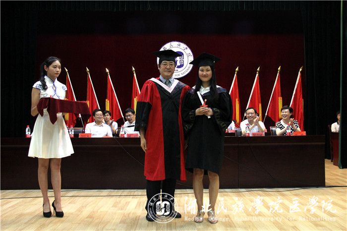大会在庄严的国歌中拉开序幕。大会伊始,由我院党委书记刘红老师宣读《湖北民族学院医学院优秀毕业生》表彰文件,我院副院长罗洪斌老师宣读《湖北民族学院2017届毕业生学位授予名单》。紧接着,由我院院长向阳为毕业生代表授予学位。毕业生代表们身着学士服,头顶学士帽,走向舞台,收获自己种了四年或五年的硕果。优秀毕业生代表冯一洲同学将大学5年的自身感悟与大家分享共勉。他表示,医学之路漫长而艰辛,我们应不忘初心,不让日渐恶化的医患关系影响我们的决心。此外,我们还应心怀感恩,感恩宿管阿姨,感恩老师,感恩医学院,感恩湖北民族学院。随后,教师代表陈龙菊老师发言,她围绕不忘民院精神、珍惜友情、努力栽培自己三方面展开演讲。陈老师指出,机会总是留给有准备的人,只有努力栽培自己的人才有可能得到眷顾。最后,由我校党委书记吴建清书记致辞。吴书记对毕业生提出了三个期望,他希望同学们在今后生活中“铭记医学生誓言,不负初心”、“行以致学,学以致用”和“情系家国,常怀感恩之心”。他说到,面对纵横交错的社会利益,错综复杂的社会矛盾,我们要多一些冷静,少一些盲从,多一些独立思考,少一些偏信。社会浮躁,但是教育不能浮躁,医学更不能浮躁。