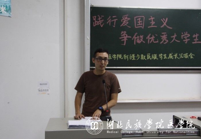 活动开始,全体起立奏唱国歌。接着,五位新疆毕业优秀生一 一上台向大家讲诉自己的大学经历。来自临床医学的伊尔夏提·吐逊江成功考入新疆当地医科大学的研究生。他在自己的成长汇报中讲到,在这几年的大学生活中,他积极参加学校的活动,充实自己的大学生活。他是我校M·E·C协会的最初创始人之一,也是协会的副会长,同时他也积极参考英语四、六级等考试,荣获"优秀三好学生"、"优秀学生干部"等称号。他从准确定位目标、清晰思想方向、自身考研经历三个方面向学弟学妹们讲解如何规划自己的大学生活,让同学们对自己以后得大学生活有了基本的定位。而其他四位优秀毕业生也分别从自身的经历讲诉了自己的大学生活,同时他们都在自己的汇报中讲到,一定要加强自身的思想意识,要热爱祖国,维护民族团结,也告诫自己的学弟学妹们一定要相信自己的能力,只要努力一定能成功。