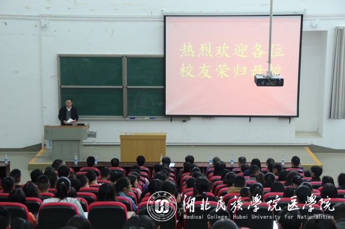 讲座伊始,肖骏教授以“医路心路”为主题,向同学们阐释何为“医路”、“心路”。当谈及 “医路”时,他希望在座的医学生,在未来的行医之路中都能找到适合自己的路。在讲到“心路”时,他以“中国外科之父”裘法祖先生的事迹教育在座同学,在未来行医的道路上,一定要有“医者仁心”,对待患者要有耐心、恒心、仁爱之心以及怜悯之心。随后,张安静从“什么是机会成本”、“人生没有白走的路,每一步都算数”、“你若盛开,清风自来”三个话题引出主题“你必须成为自己首席执行官”,让在场听众明白如何通过自己不断努力干出实绩,做好未来的职业规划。讲座完毕后,学生代表任莹芳上台发言,她首先感谢八八届学长学姐对贫困学子的帮助,并代受资助的贫困学子宣誓,当他们有能力之时,一定会将这份爱心传递下去。