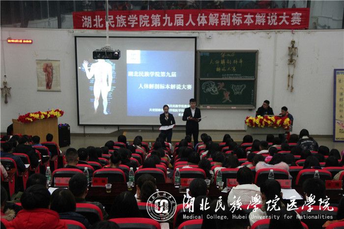 本网讯(通讯员 李明辉 苗佩佩 卢天琳/文 杨漫丽/摄)为弘扬医学风采,进一步展现我院特色,12月11日,由我校教务处主办、我院团委承办的第九届人体解剖标本解说大赛决赛于修远楼5B509教室举行。我院解剖教研室老师李国贵、陈龙菊、谭文波、吴刚、谭刚担任评委,我院党委副书记张蕊、学生科科长向驰及团委书记张鼎应邀出席。