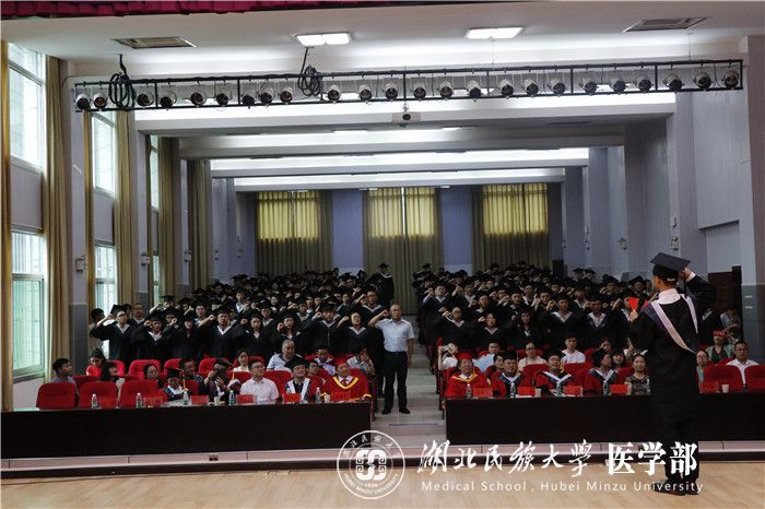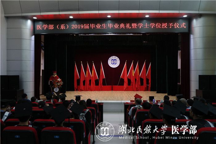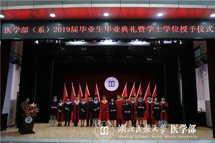典礼在庄严的国歌声中拉开帷幕。学校副校长、医学部党委书记、主任祝建波致辞并对同学们提出三点嘱托:一是希望同学们以仁爱立德行;二是希望同学们以学习明志向;三是希望同学们以梦想为追求。随后,陈勇宣读《365电子娱乐官方网站医学部2019届优秀毕业生表彰决定》、刘红宣读《 关于拟授予365电子娱乐官方网站2019届医学专业本科毕业生学士学位的决定》,廖云宣读《湖北民族学院科技学院医学系2019届优秀毕业生表彰决定》、《关于拟授予365电子娱乐官方网站科技学院2019届医学专业本科毕业生学士学位的决定》。接着,吴建清等8位导师为每一位身着学士盛装的毕业生援苏正冠、颁授学位证书并合影留念。优秀学生代表张志文发言,他回忆数载大学时光,满怀对母校的感激与自豪之情,也希望毕业生不忘医学初心,勇担医者艰辛,追求卓越创新。教师代表徐俊芳寄语学子:坚守仁心,精进医学,常怀感恩。