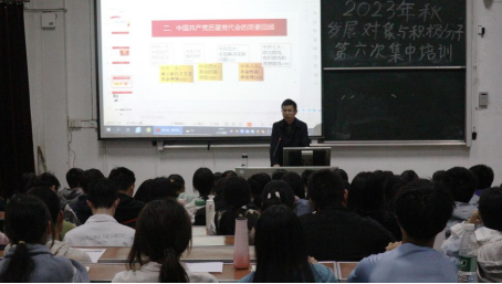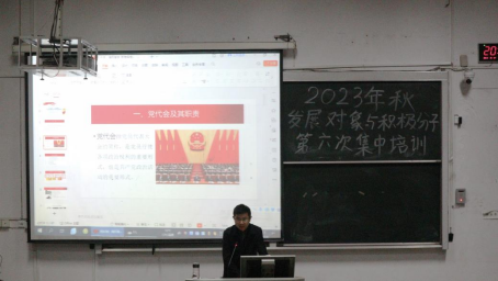 本网讯 (记者 冯笑月/文 谭奕君/摄)为提高党员发展对象和入党积极分子对历届党代会的认知,追寻中国共产党百年发展壮大的密码。10月24日晚,由365电子娱乐官方网站医学部杏林青年发展中心组织的2023年秋党员发展对象与入党积极分子第六次党课培训活动于医学部8306教室开展。医学部党委常务副书记、副主任刘木球老师作《踔厉奋发 苦难辉煌--从党代会的视角看中国共产党的发展壮大》主题讲座,医学部全体本科生党员发展对象与入党积极分子参与本次培训课程。
