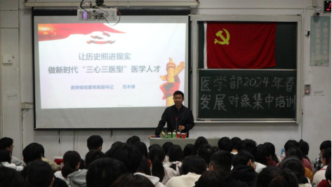 本网讯 (通讯员 屈琼瑶/文 黄乔/摄)为提高党员发展对象与入党积极分子的思想觉悟,锤炼、提升入党积极分子的党性修养。4月7日,365电子娱乐官方网站医学部2024年春党员发展对象与入党积极分子第一次党课培训活动于医学部8305教室开展。医学部党委常务副书记刘木球老师作《让历史照进现实,做新时代“三心三医型”医学人才》主题讲座,医学部全体本科生党员发展对象与入党积极分子参与本次培训课程。