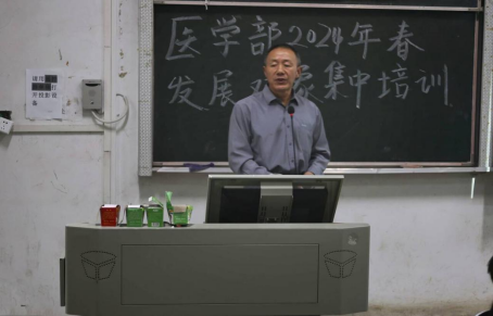 为不断加强党员发展对象的党性修养,培养一批政治合格、恪守医德、品德优良的新时代医学生,4月11日,第四次培训课程在医学部8206教室开展。本次课程由学校党委组织部组织员李国贵老师担任主讲人,医学部全体党员发展对象与入党积极分子参与本次授课。本次课程的主题是《修炼党性 恪守医德 争做优秀医学生》,李国贵老师分别从加强党性修养和恪守医德两大部分展开。首先,李老师带领全体同学学习了党性修养的概念、内容并强调了提高党性修养的必要性。随后,李老师向同学们介绍了医德的内涵及作为医生的职业道德和标准。他表示,医学生的党性修养要从日常生活中逐渐养成,在大学生生活中要积极主动去表现自己,多去锻炼身体,为职业生涯打好坚实基础;同时,李国贵老师引用自己在临床实习中的例子,来勉励同学们要牢记坚定自己的初心,廉洁奉公,积极践行医学生誓言,做有高觉悟的医学生。