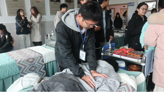 体验中,工作人员会穿插讲解土家医药的趣味渊源:比如三百棒需选秋冬老枝茎,是当地“散寒秘宝”;酒火疗法源自先民“以酒驱寒、以火通阳”的生活智慧。现场师生边体验边交流技法体感、养生技巧,轻缓的操作声与讨论声交织,实验室里暖意融融,既缓解了冬日不适,也让民族医药文化在互动中自然传递。