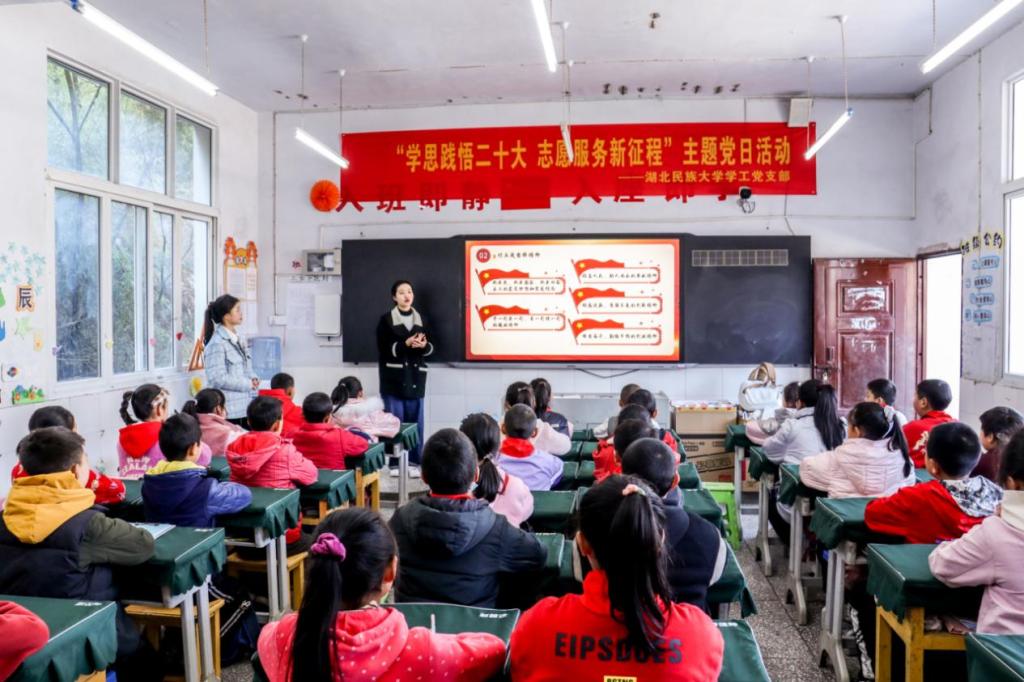 为深入学习宣传贯彻党的二十大精神,进一步弘扬志愿服务精神,3月15日,我校学工党支部赴利川市凉雾乡马前小学开展“学思践二十大 志愿服务新征程”特色主题党日活动。学校党委副书记邓磊以普通党员身份出席活动,学工党支部全体党员、学校驻马前村工作人员、校青马班学员代表及马前小学五(1)班36名学生一同参与活动。